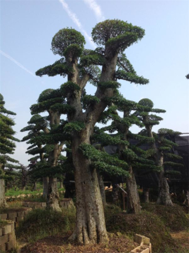 造型榆樹:選用深山老林采挖的形態(tài)各異的老榆樹移植至素沙土地,經(jīng)過數(shù)年的精心培育,枝葉茂盛之后方可造型。